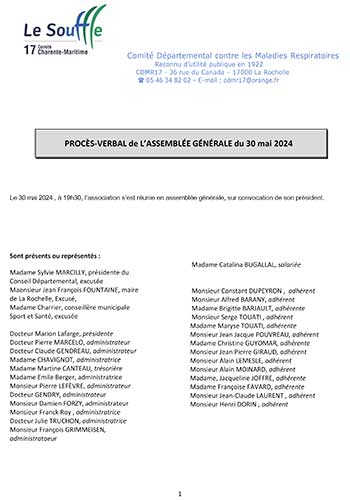 notre conseil d’administration est composé de 12 personnes : des pneumologues, des retraités, des malades respiratoires, un expert-comptable, une infirmière, un kinésithérapeute : Docteur Marion LAFARGE Présidente, Madame Martine CANTEAU Trésorière, Docteur Claude GENDREAU Administrateur, Docteur Pierre MARCELO Administrateur, Docteur Julie TRUCHON Administratrice, Madame Marie-Paule TOUVRON CHAVIGNOT Administratrice, Monsieur Damien FORZY Administrateur, Docteur Thierry GENDRY Administrateur, Monsieur Franck ROY Administrateur, Madame Émilie BERGER Administratrice, Monsieur Pierre LEFEVRE Administrateur, Monsieur François GRIMMEISEN Administrateur
